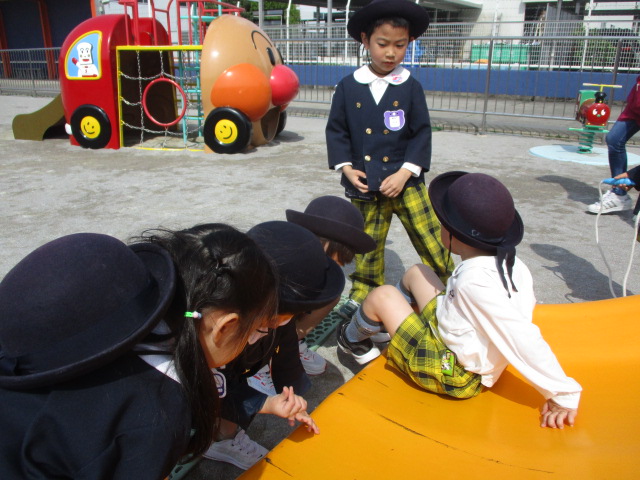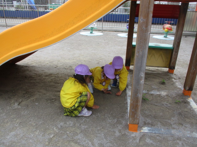 大きな滑り台に虫がいたので中断して虫観察が始まりました。