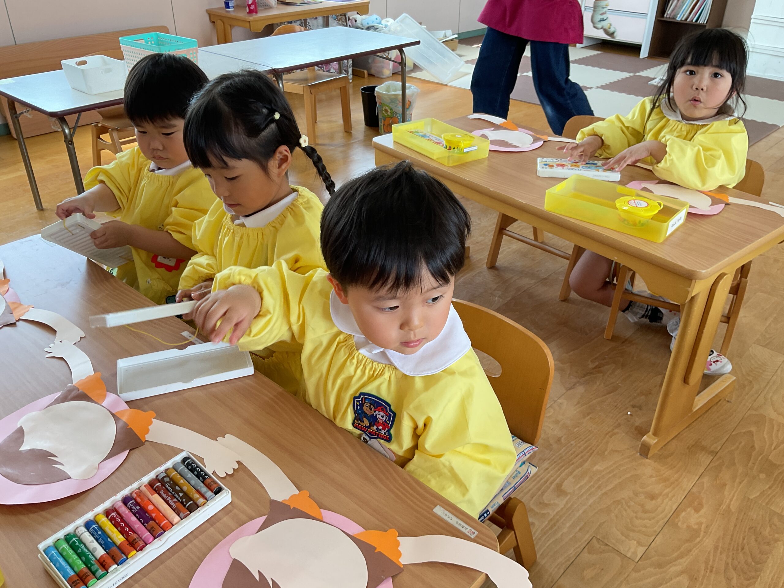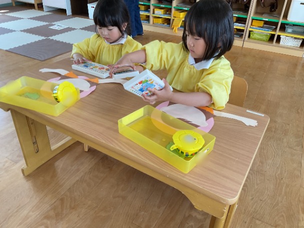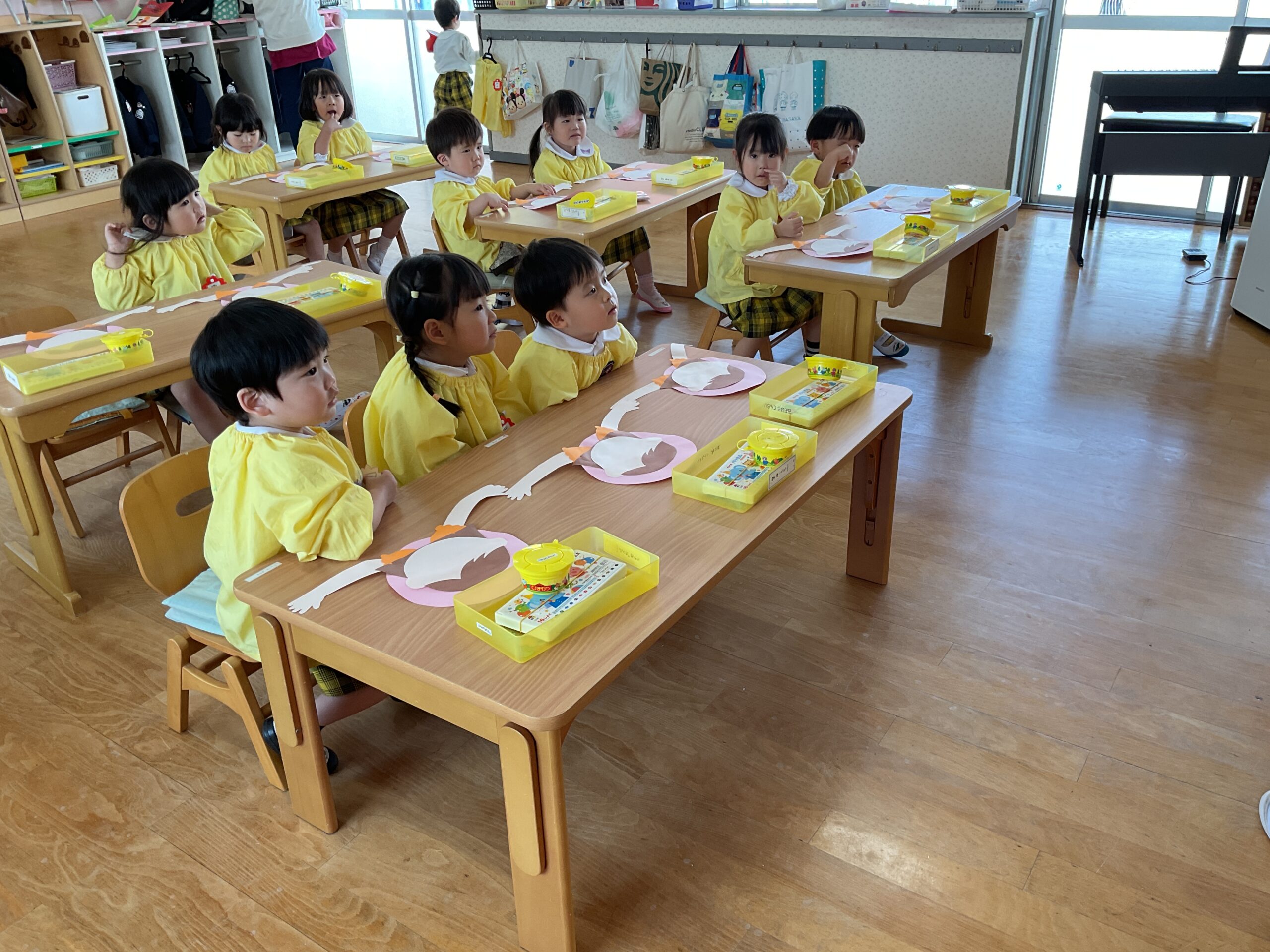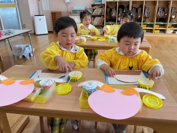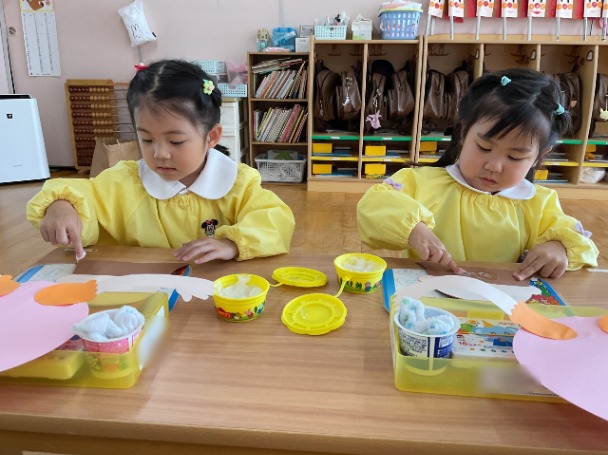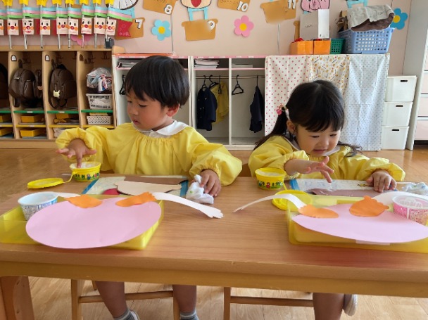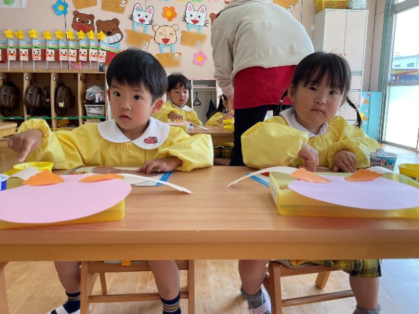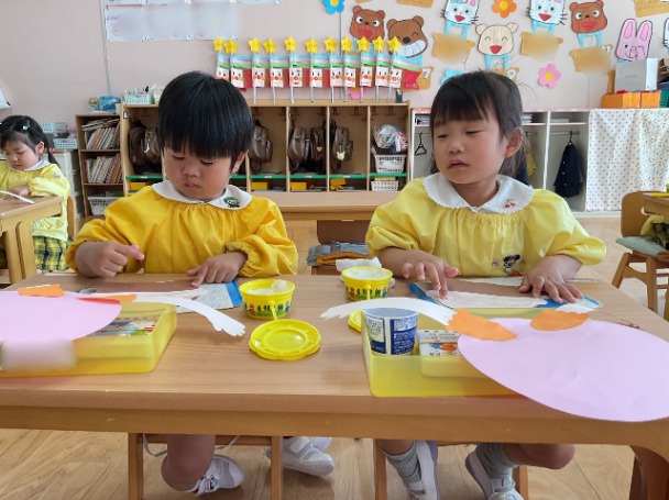 今日は、年少さんが 母の日の製作 をしました。 まずは、のりを使ってパーツをぺたぺた貼りつけながら、ゆっくりと形を作っていきました。のりの量を調整したり、指先を上手に使ったりと、みんなとても集中して取り組んでいました。