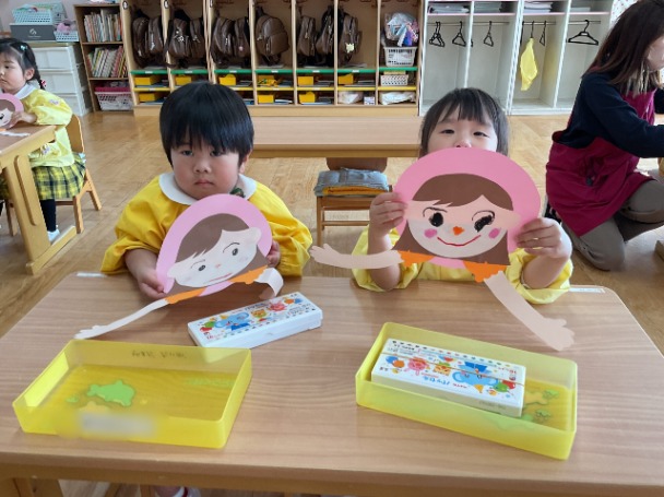 そのあとは、お母さんの顔を思い出しながら クレパスでお顔を描きました。 「にこにこだよ」「めがねかけてるの」など、思い出したことを話しながら描く姿がとてもかわいらしく、どの子も大好きなお母さんを思い浮かべているのが伝わってきました。